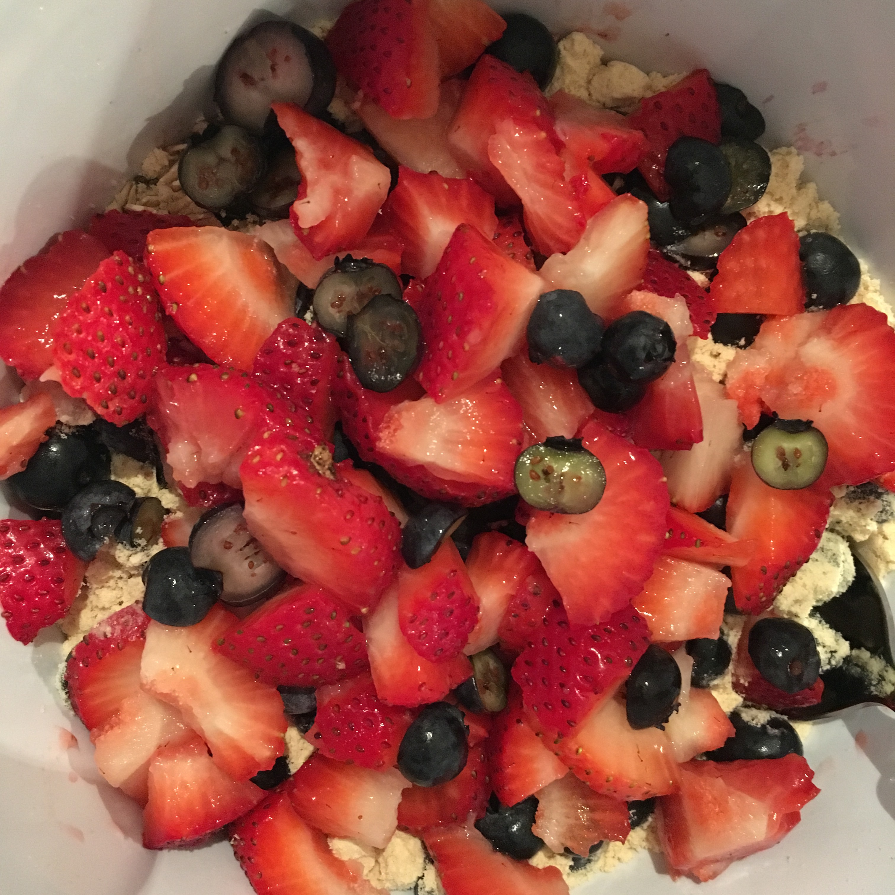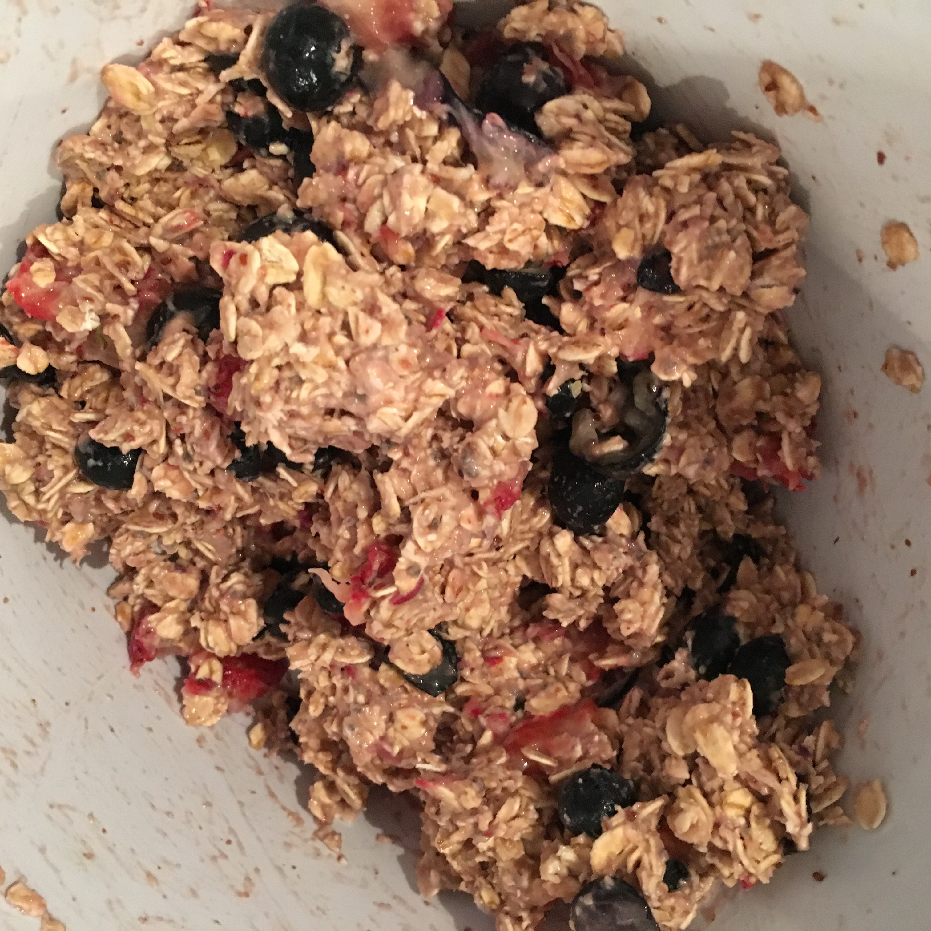 Ingredients: 2 cups rolled oats, 2 tablespoons of flax seeds, 2 tablespoons of chia seeds, handful of strawberries, handful of blueberries, 1 scoop of vegan protein powder, 1 tablespoon of coconut oil. Add honey/agave to taste.