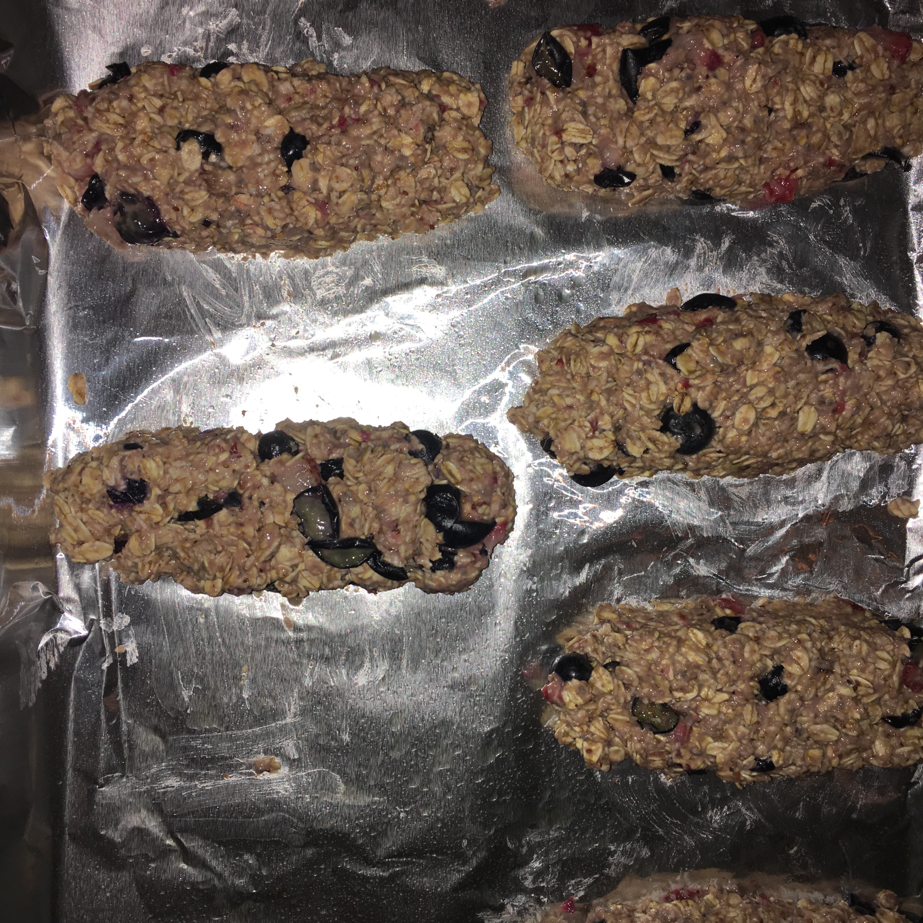 Once mixed, form bars onto greased tin foil on pan (recipe makes 6). Bake for 15 mins. Let cool for at least 5 minutes.